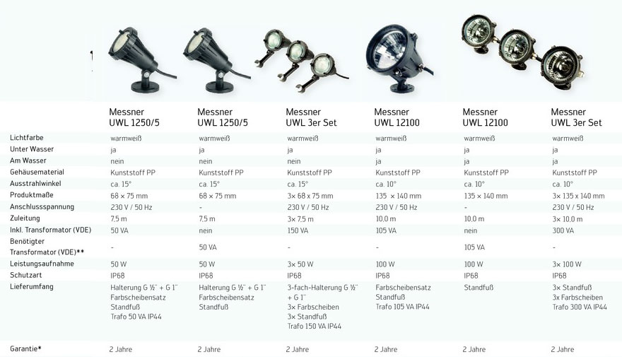 Der Mesner Unterwasserscheinwerfer UWL 50 Watt ist nur für den Einsatz im Wasser geeignet, die 20 Watt und 100 Watt Scheinwerfer können auch im Außenbereich eingesetzt werden.